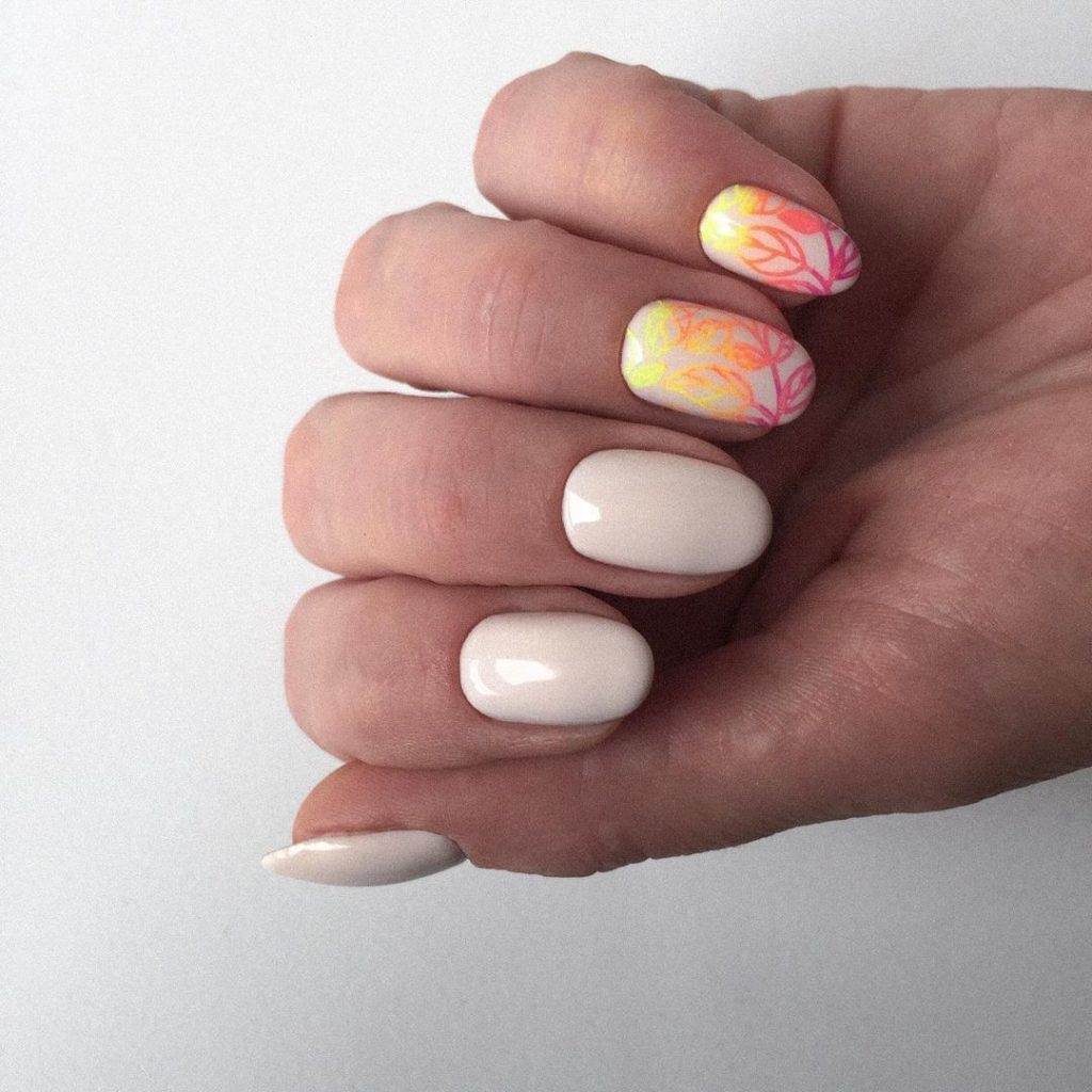 Скомбінуй усі тренди – зроби манікюр з рослинним жовто-рожевим неоновим орнаментом, виконаним у техніці омбре, а для основи візьми блідо-бежевий гель-лак №009. Ніжність і яскравість, та ще й з флористичними мотивами – ідеальне поєднання для літнього чи весняного манікюру