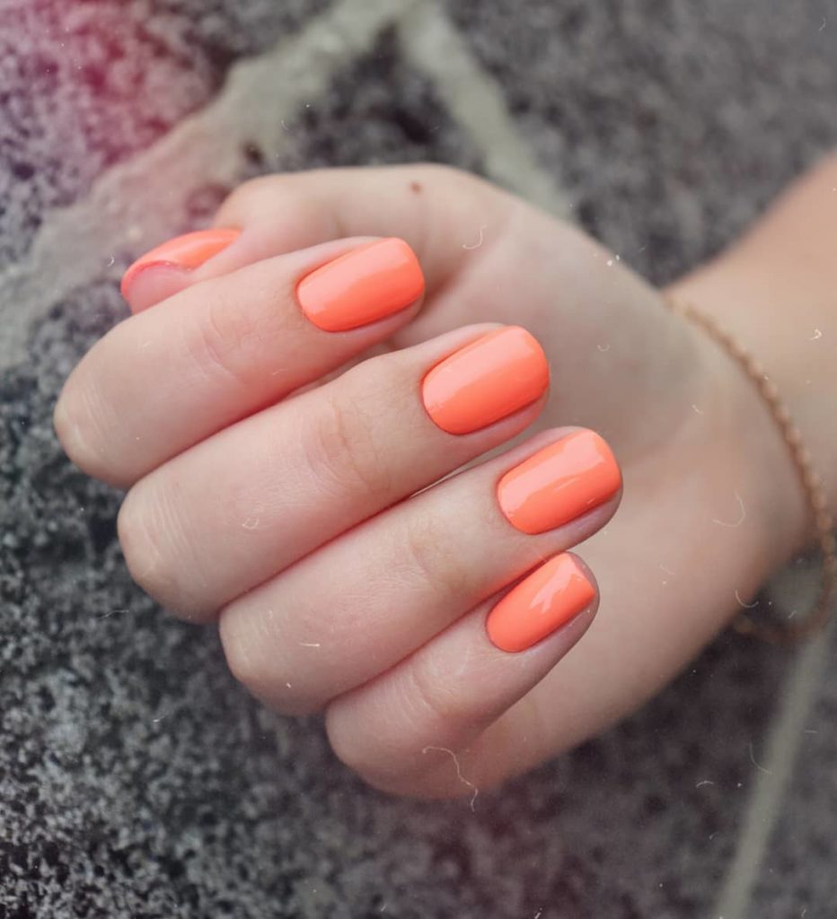 Неонові кольори – самодостатні та мають крутий вигляд навіть без додаткових акцентів, особливо цієї весни. Однотонне покриття з неоновим морквяним гель-лаком №019 – соковите, яскраве та стильне без жодного декору!