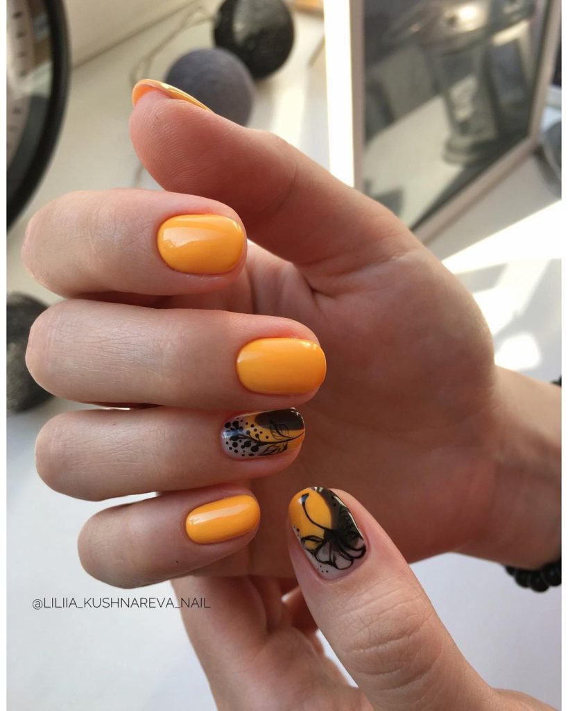 А тепер уяви, який крутий вигляд матиме флористичний розпис у комбінації з теплими відтінками, наприклад, помаранчевим гель-лаком №21. Це ніби власне літо на нігтиках