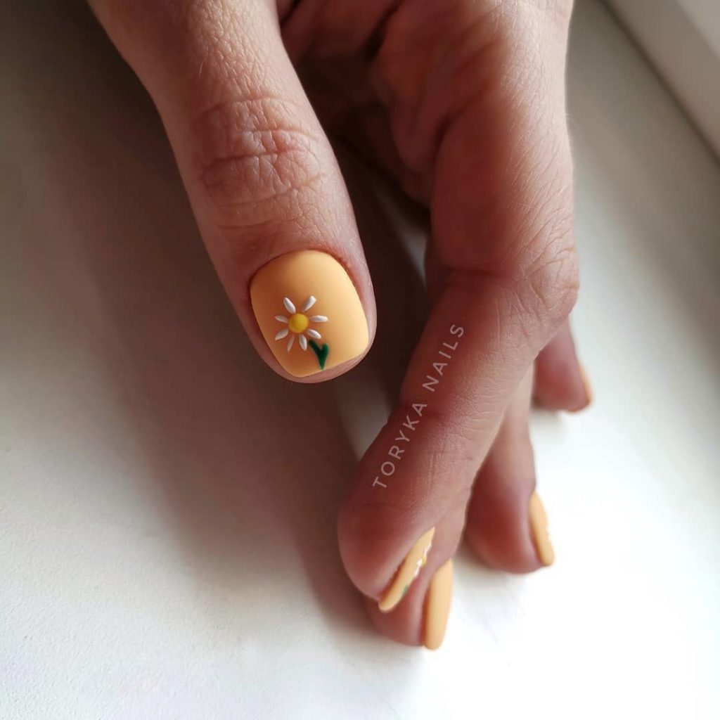 Якщо ж ти хочеш трохи більше легкості, то використай для фону ніжніший відтінок, такий як бежево-персиковий №22, прикрась манікюр декором у вигляді тендітної ромашки та покрий його матовим топом. Кіра запевняє, що з таким дизайном тебе завжди переслідуватиме легкий весняний настрій