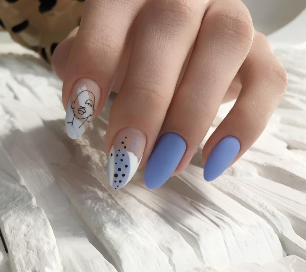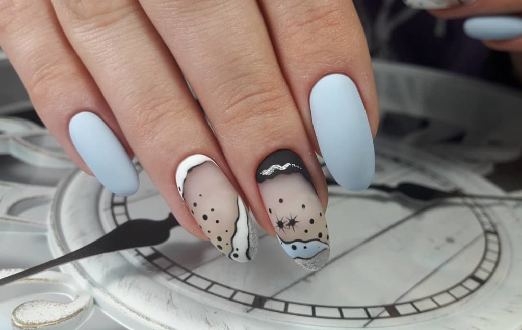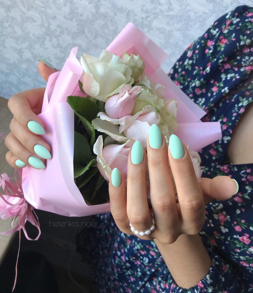 В комбінації з чорним, білим і сріблястим, та ще й з матовим топом, він стає ще ніжнішим і налаштовує на мрійливий настрій. Неймовірно крутий варіант манікюру для безтурботних літніх днів