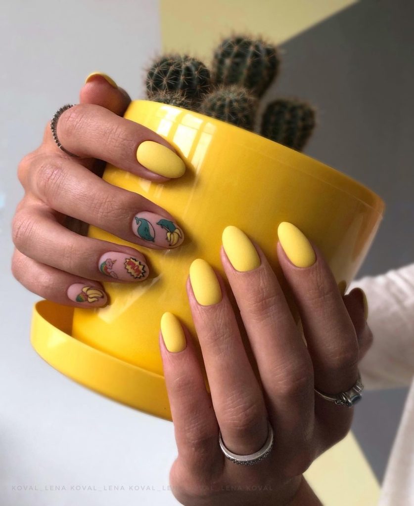 Наприклад, спробуй дизайн з сонячним жовтим №073 Kira Nais – це вибір дівчат, які не бояться привертати увагу. Яскравий відтінок неймовірно круто виглядає у матовому виконанні та вигідно поєднується з рожевим, особливо в комбінації з екзотичними елементами у дизайні