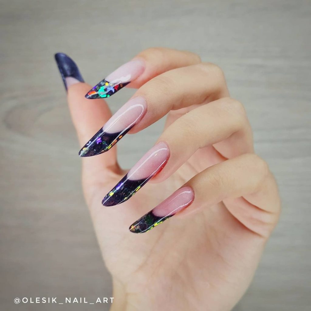Для тих, хто любить усе незвичайне, Кіра теж приготувала кілька порад. Зроби основу з нюдовим бежем, додай якомога більше блискіток та заверши манікюр синім вітражним гель-лаком №09. З таким дизайном на літній дискотеці тобі точно не буде рівних