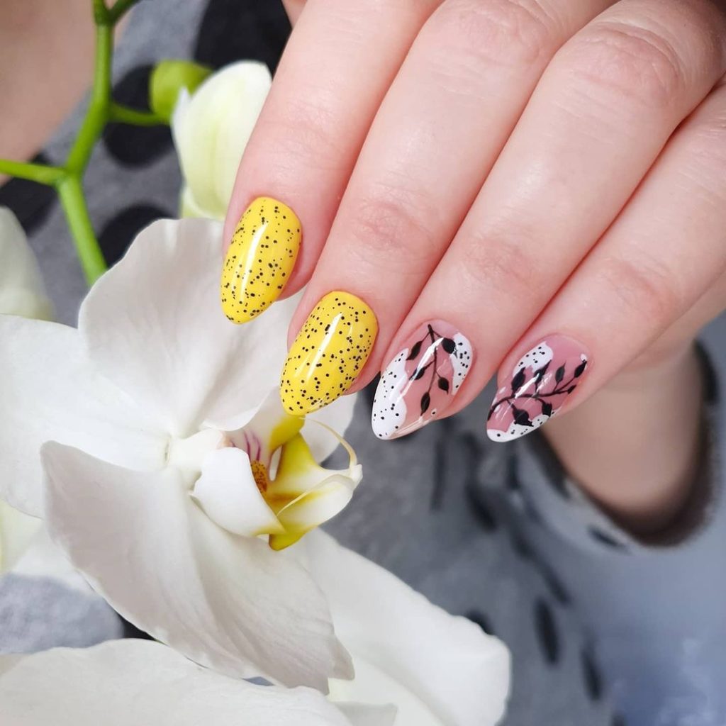 А якщо душа бажає ще більше фарб, то спробуй поєднати флористичні мотиви з монопокриттям жовтим гель-лаком, покривши його Чіа Топом KIRA NAILS. Це вже ніби справжнє сонечко на нігтиках