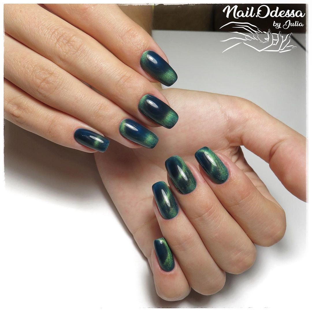 Глибину та соковитість кольору неможливо порівняти з жодними іншими видами прикрас на нігтях. Особливо популярними стали темний ялиновий, гіпнотичний гренадин і сапфіровий колір. Вони додадуть манікюру вишуканої глибини та 3D-об’єму.